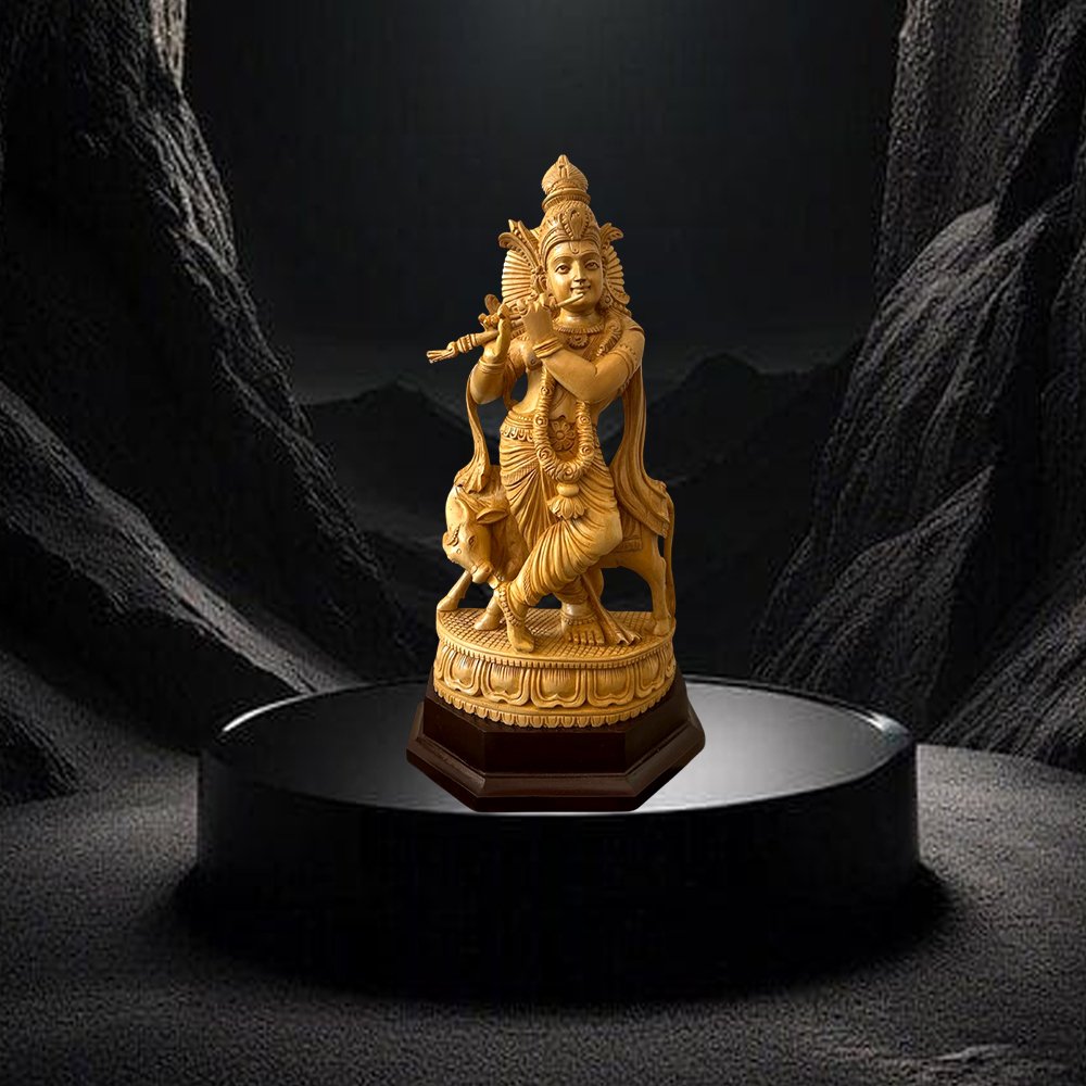 Each Lord Krishna with Cow idol is a unique creation, hand-carved by master artisans from Kerala. These artisans preserve centuries-old techniques, ensuring that every curve, detail, and expression reflects the heritage of traditional Kerala craftsmanship. The rarity of their work means that each piece is one-of-a-kind, making it a treasured collectible and a legacy item for generations.
