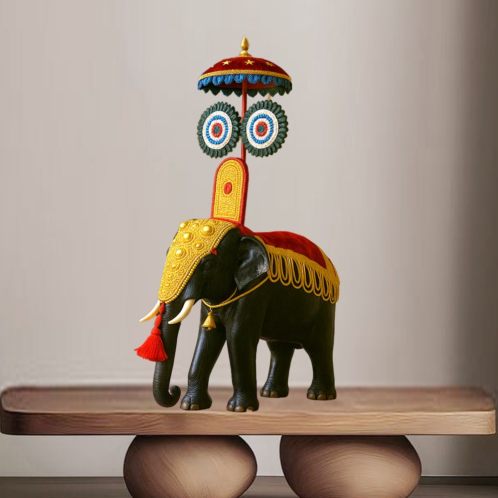this Pooram elephant statue is charming and traditional symbol yet it goes well with my modern decor. The colourful umbrella is so regal and dramatic….